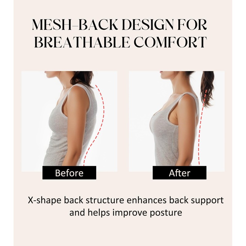 - Back Posture: The X-shape back reinforcement for back support and correct posture, keeping you straight and glamorous. And criss-cross posture back has mesh areas for breathability.