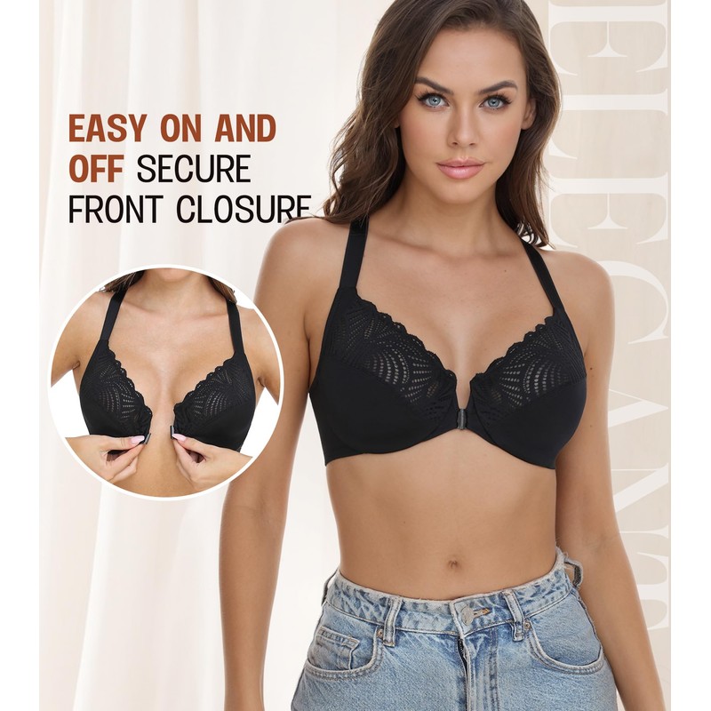 - Front Closure Bra: With front closure, is easy to put on and off. You don’t need to reaching behind your back to clasp. Suitable for the elderly, the lady who have undergone surgery, or someone with arm pain.