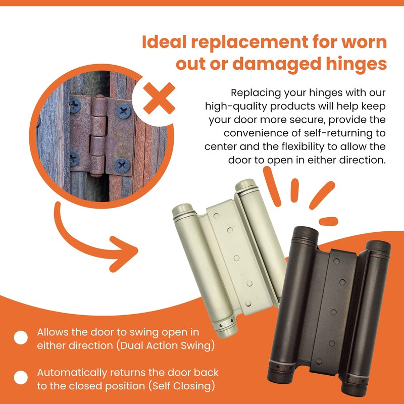 - WHAT COMES IN THE PACKAGE: This Double Acting Gravity Hinge is the hardware of choice to install a set of swinging or saloon doors. Hinges will hang 2 doors. This easy-to-install hinge hardware for a swinging door comes with wood screws that fit a door with a thickness of 3/4" to 1-3/8".