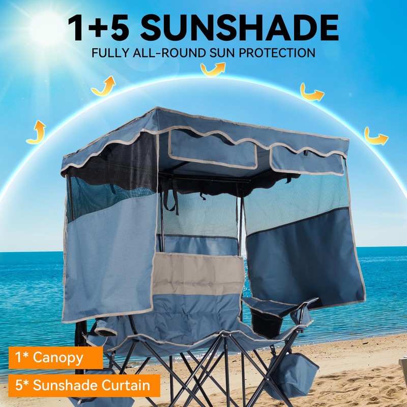 - Full Sunshade: Our double camping chair with shade canopy is equipped with four-sided sunshade curtains, of which the side curtains and front curtains can be flexibly retracted, easily adjusting privacy and ventilation, effectively blocking sunlight from all angles, adapting to a variety of outdoor environments, and making outdoor life more comfortable!