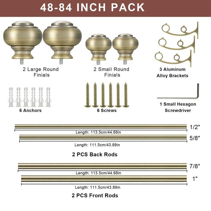 - EASY TO INSTALL: The double window rod 48-84" packed with 1 set of front rod (2pcs rods), 1 set of back rod (2pcs rods), 2 large finials, 2 small finials, 3 double brackets, 1 set of screws & anchors and instructions. You can mount these curtain rods easily on the wall.