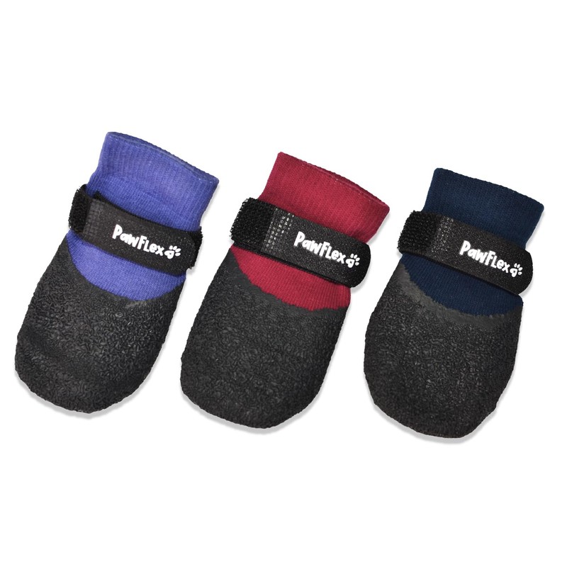 PawFlex Comfy Pawz Nonslip socks come 4 types: Full coverage long socks, low rise socks, long smooth waterproof rubber double dipped socks/booties, and low rise textured waterproof rubber double dipped socks.