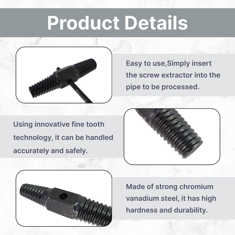 - Double head design for versatile applications on different pipe sizes: double head screw extractor. The practical double head design allows you to work with 1/2 inch and 3/4 inch pipes with just one tool. Double head screw extractor ideal for working on water pipes, heating valves and defective fittings in household and industry.