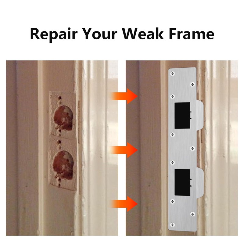 - Fix Broken Door Jamb: One-piece designed to replace the standard, separate latch plates. More exquisite and sturdy. It can also be used to hide flaws or broken areas in jamb. Solved problem that door had with handle latch and deadbolt not catching. The dimension of the holes is large enough to allow for seasonal ground movement and keep the latches work properly.