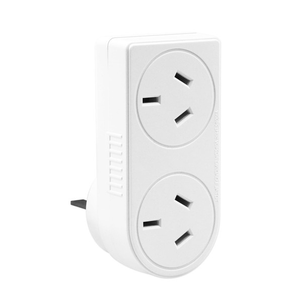 White Colour, 10Amp Plug, 2 Outlet, Left Hand Adaptor, 10A 240V 2400W(Max.), Made From Quality Pure Copper and Fire Resitant PVC Material, Approved by SAA(AS/NZS 3199:2007) Certification.