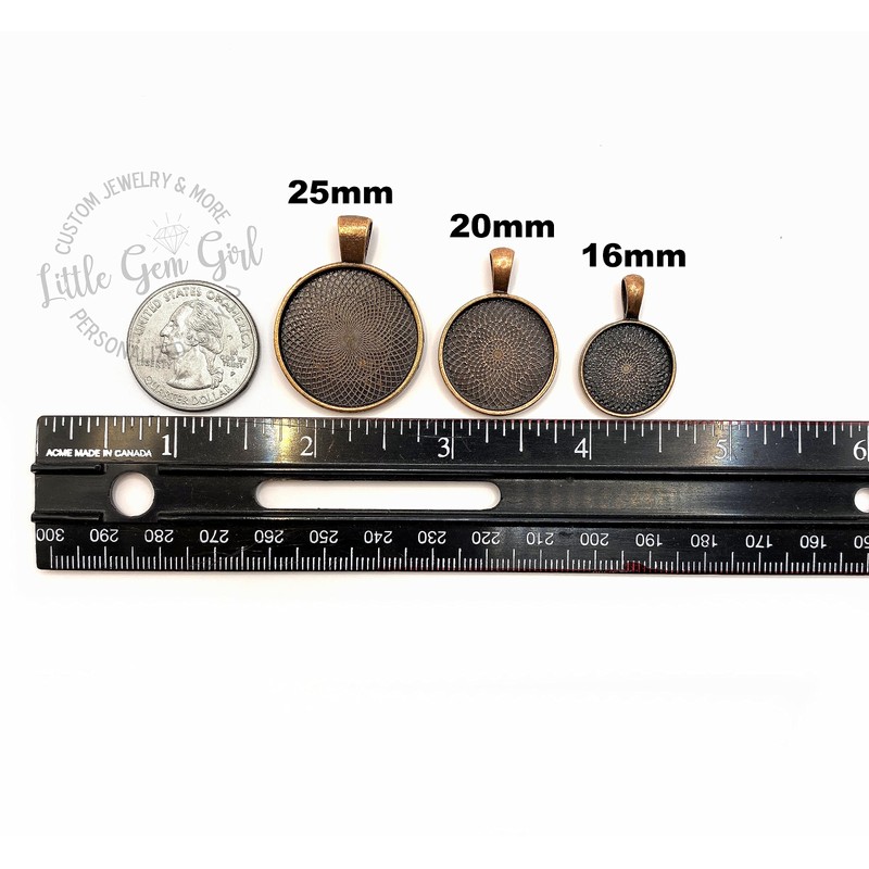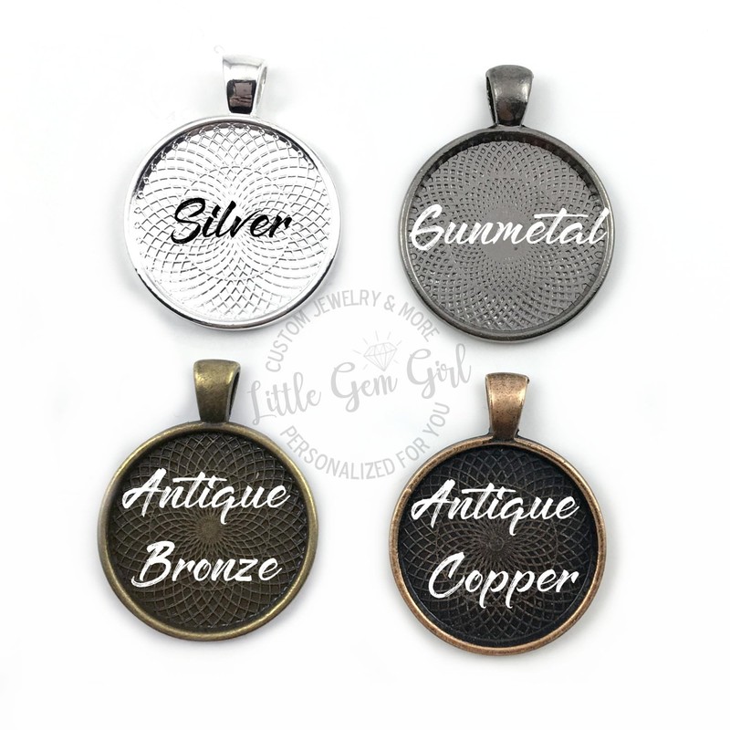 - *Metal Finish - Antique Bronze or Copper, Silver or Gunmetal. *Choose the background design for the front of the charm. 23 different styles available. *Kids Names - please list these in the personalization box. We'll arrange them to fit best and will use a mix of fun fonts. *Style: Necklace or Key Chain. *Charm is 25mm, 1 inch in diameter