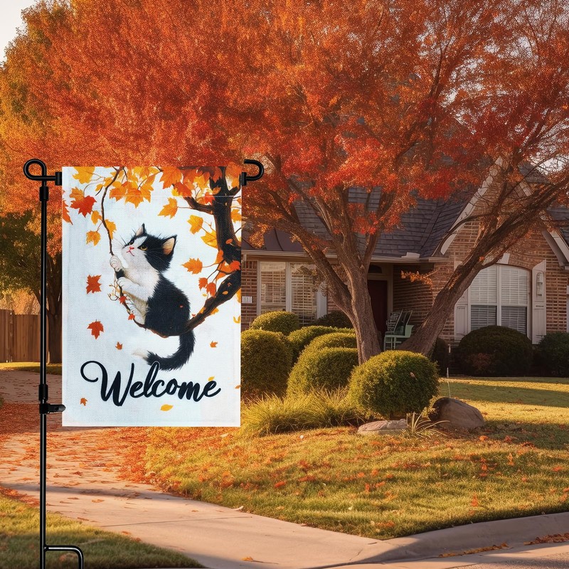 - Fall Garden Flag with Stand - This unique and charming garden flag design features a cute and playful cat peacefully resting on a fall maple tree, happily welcoming the arrival of autumn. Let this garden flag weave a rustic warmth into your autumn garden trail