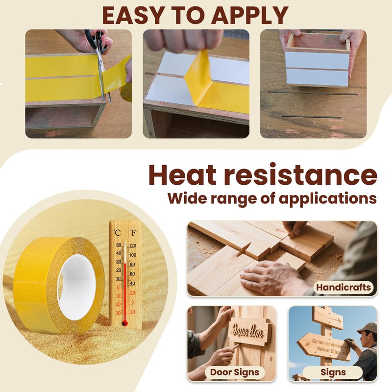 - This double wood tape is made of high-quality PVC material and strong adhesive on both sides, with yellow paper backing,strong adhesion, long,easy to peel off and apply, removable, residue free,Heat resistance,Stretch resistance
