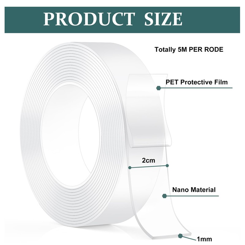 - 【Strength and Durable】This strong double sided tape can hold up to 1lb on smooth surfaces per 1-Inch. Forget the ordingary double sided nano tape and we've got you a tape for all your needs! Item size is Lenght 5m, Width 20mm and Tickness 2mm.