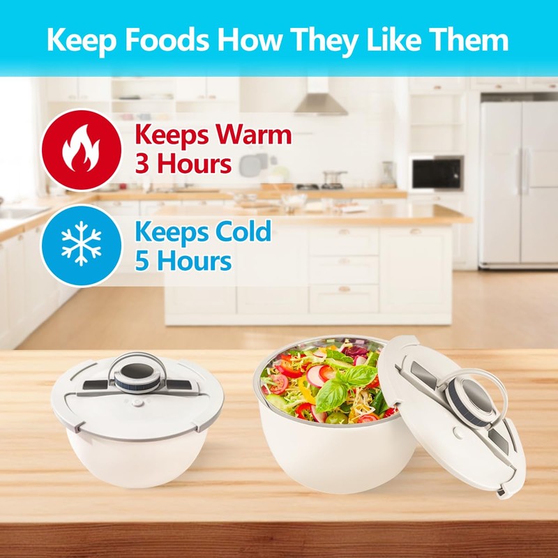 - TEMPERATURE CONTROLLED - The vacuum-insulated bowl maintains food temperature warm for up to 3 hours and cold up to 5 hours. With the double-walled technology, it has a stay-cool exterior. Perfect for bringing a dish to share to every occasion or household use.