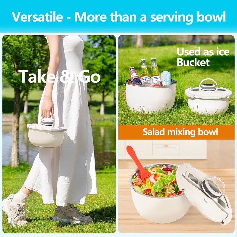 - INSULATED BOWL - Our thermal bowl is made with double-walled food grade stainless steel, which keeps your food warmer or colder for longer than a typical container. Take meals for all the events or parties on the go. Maintain your soup, salad, hot dips, pasta to the good temperature for your guests, friends or family entertaining. Can also be used as a serving bowl at home.