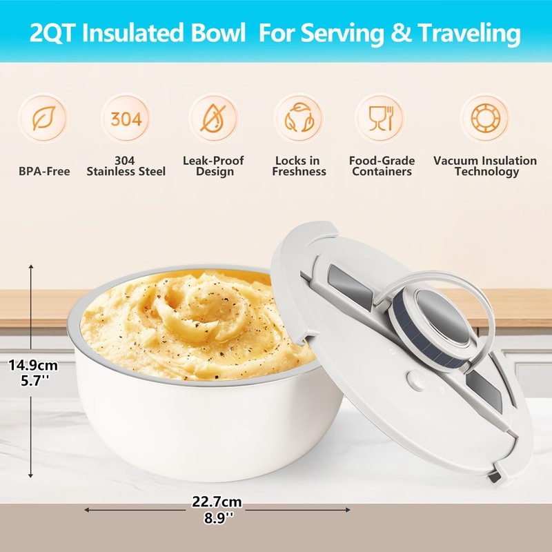 Double-Walled Stainless Steel Insulated Serving Bowl with Leak - Proof Lid - Insulated Casserole Dish - Keeps Food Warm and Cold for Hours - Perfect for Holidays, Parties, Camping - (2Q, White)