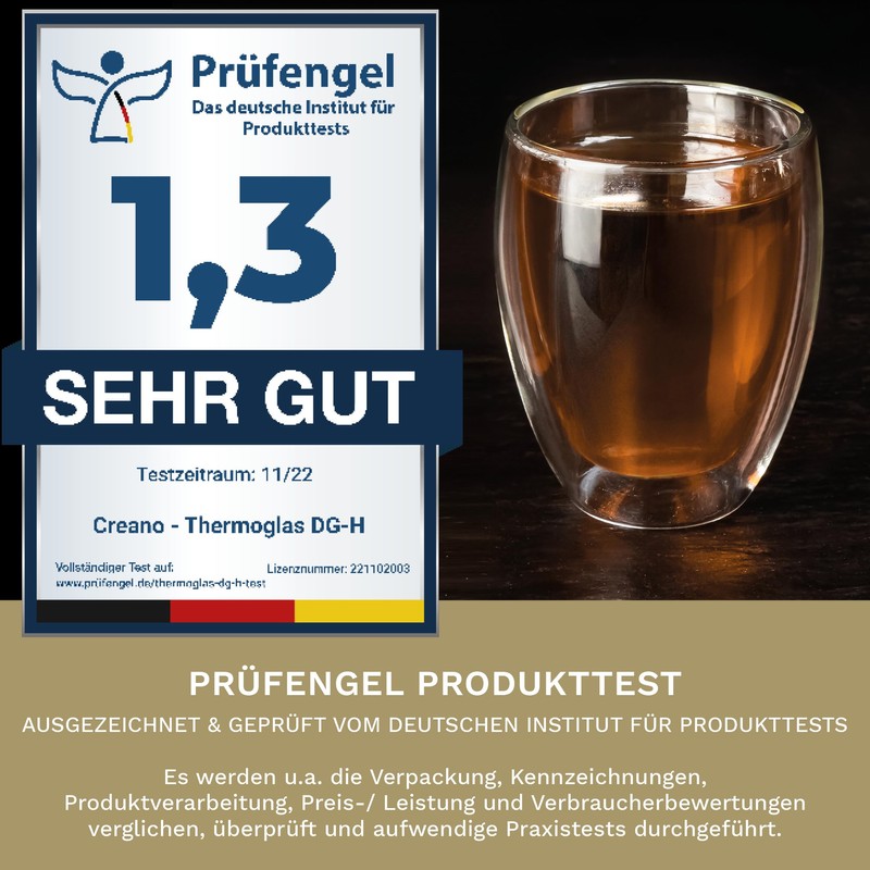 The Creano thermal glass "DG-Hoch, 400 ml". The thermal glass is stylish and functional at the same time - the mouth-blown double wall glass with its excellent insulating properties makes it possible. Heat-resistant borosilicate glass is used for production, which is light and delicate, yet robust meets the high demands of everyday use. Thanks to the insulating effect - made possible by the air between the glass layers - hot drinks such as coffee or tea stay hot for longer and cold drinks cold longer. In addition, the double wall glass ensures an always evenly tempered outer glass, so that even possible burning of the fingers is a thing of the past. Great effect also: no annoying condensation, so no annoying edges on the table when enjoying cold drinks. The features of the thermal glass insulating, handmade made from heat-resistant borosilicate glass, 400 ml capacity, dishwasher safe. Contents: 1 Creano thermal glass "DG-Hoch, 400 ml"
