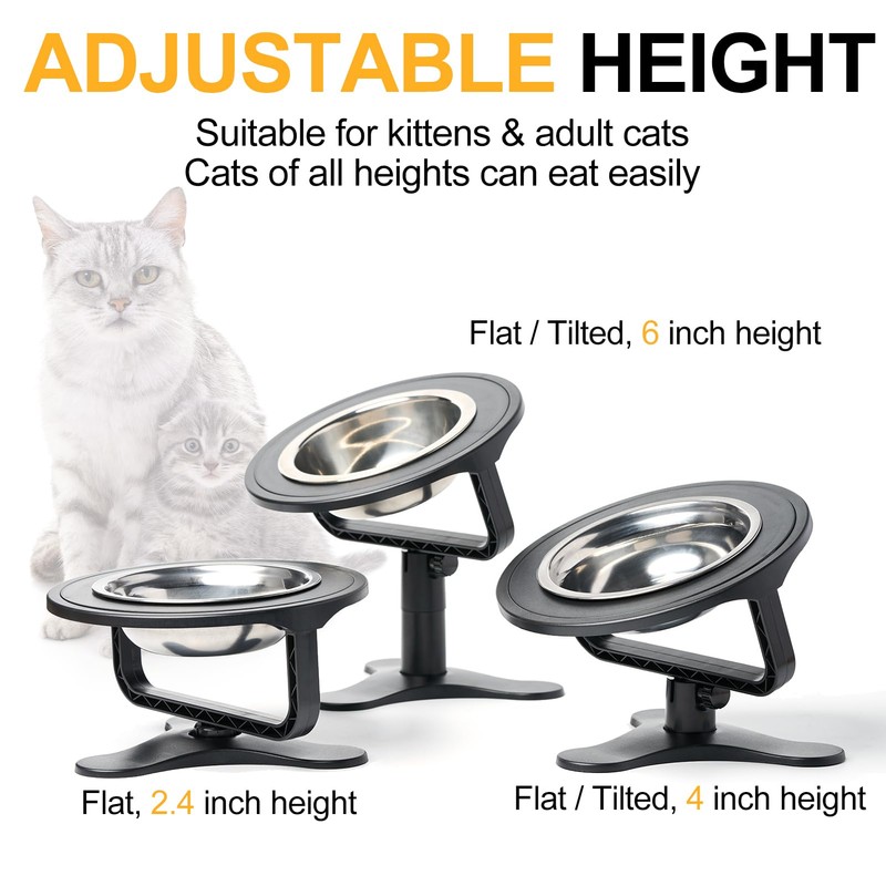 • 【Elevated Cat Bowls】This cat food bowl can be tilted between 0 and 15 degrees, with heights of 2.4, 4 and 6 inches. Adjustable bowl rack is designed to fit your pet at any stage, accompanying your cat from puppy to adult. Keeping cat bowls can make it easier and more comfortable for cats to access food and water