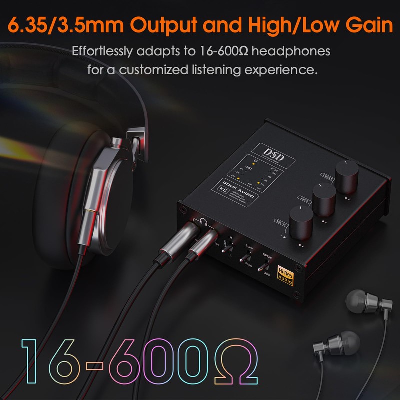 • Strong Power and High/Low Gain Modes: K5 supports dual 6.35/3.5mm headphone outputs and provides robust power of 560mW/470mW@32Ω per channel to effortlessly unleash the best performance of your headphones. Specially designed with high and low gain modes, flexibly adapt to all headphones of a wide impedance range from 16Ω to 600Ω and tailor your own listening experience.