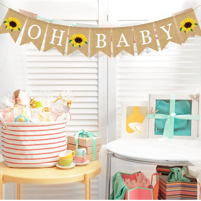 Doumeny Oh - Banner de arpillera para bebé, baby shower, girasol, guirnalda de bienvenida para bebé, diseño de girasol, diseño de género, pancarta de fiesta de género neutro para guardería, guirnalda