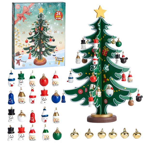 Douthfolle Advent Calendar 2024 with Wooden Christmas Tree and 30 Ornaments, 24 Days Christmas Countdown Advent Calendar Mini Christmas Tree Christmas Decoration Pendant for Crafts