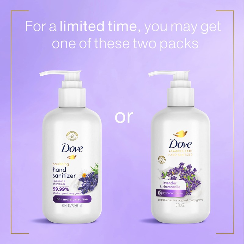 Dove Advanced Care Lavender & Chamomile Hand Sanitizer for Soft, Smooth Skin, 99.99% Effective Against Many Germs, 8 oz