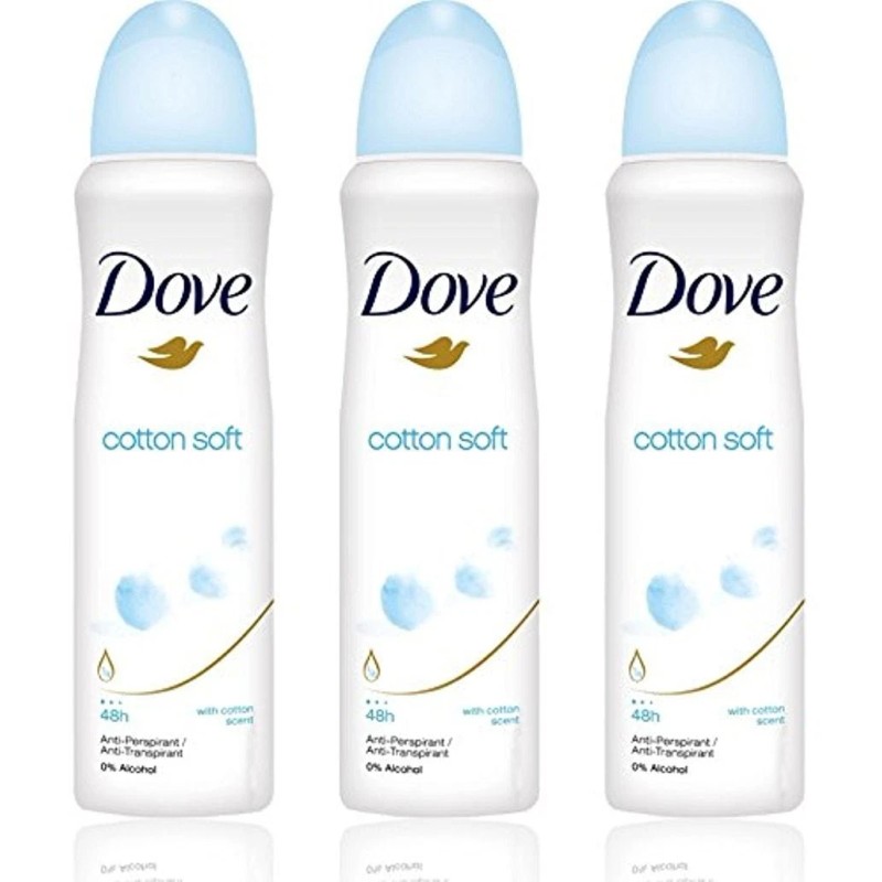 3 Dove Cotton Soft Anti:Perspirant Deodorant Spray 48 Hour Protection. INVISIBLE & GOES ON DRY : The scent is very pleasant. Goes on dry and comfortable and works all day. Will not leave white residue left on my clothes. DOVE ANTI:PERSPIRANT This antiperspirant deodorant goes on instantly dry delivering up to 48:hour protection and underarm care in a gorgeous fragrance. 48 HOURS OF PROTECTION : Each application lasts up to 48 hrs of antiperspirant protection. As well as protecting against wetness. Save time and start your day with a beautiful boost from Dove. NO ALCOHOL FORMULAS PERFECT FOR ALL SKIN TYPES : 0% (ethanol) alcohol formula helps skin recover from shaving irritation. Leaves underarms feeling soft and smooth.