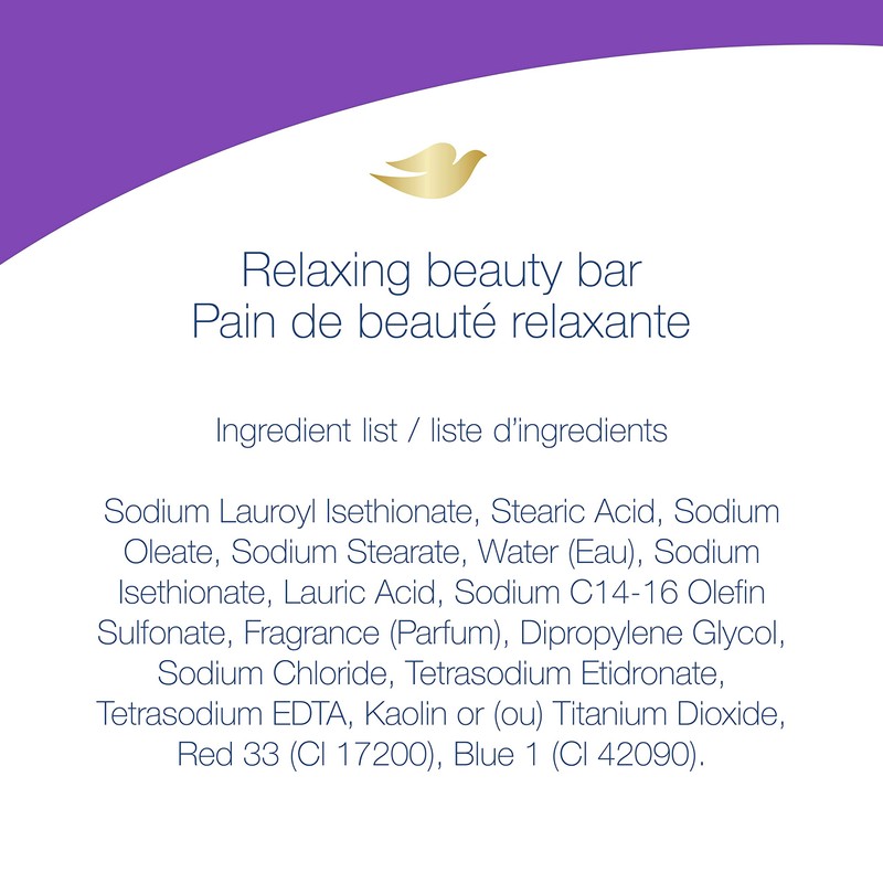 - LOCK IN MOISTURE: Dove Relaxing Beauty Bar is a moisturizing, gentle cleanser with the calming, comforting scents of lavender and chamomile.