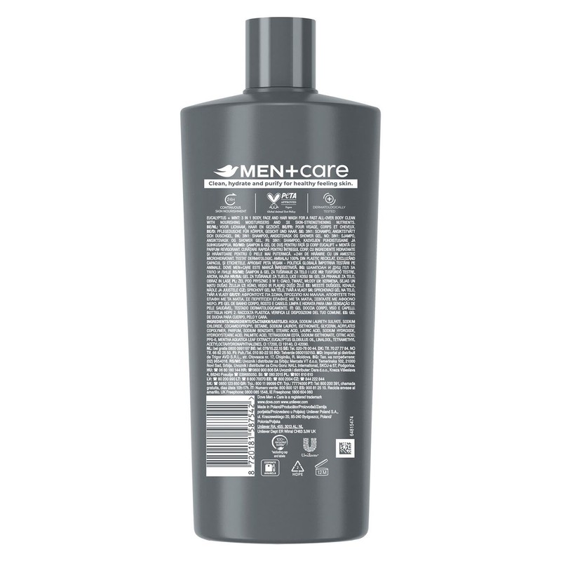 - 3-IN-1 FOR HAIR, FACE & BODY: Simplify your grooming routine with Dove Men+Care Eucalyptus + Mint 3-in-1 Shower Gel. Designed for hair, face and body, this multi-tasking cleanser saves time and space, making it ideal for daily use at home, after workouts, or on-the-go travel.