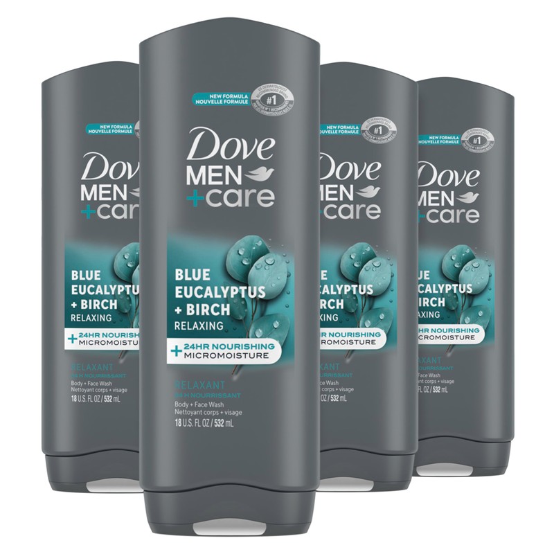 DOVE MEN + CARE DOVE MEN + CARE Mens Body Wash Blue Eucalyptus and Birch 4 Count Dry Skin Body Wash with Micromoisture, Effectively Washes Away Bacteria While Nourishing Your Skin, 18 oz