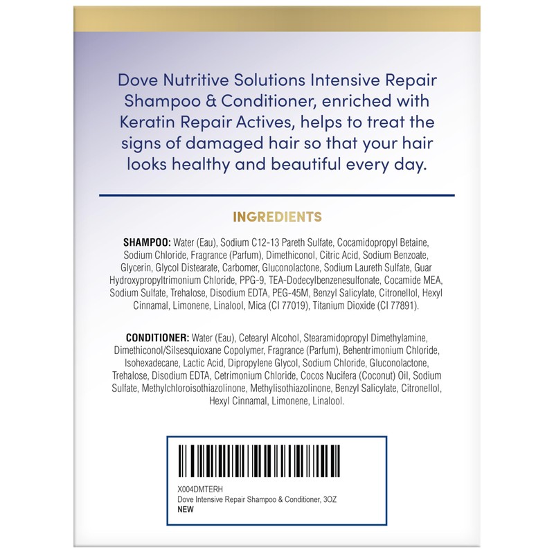 - DOVE SHAMPOO & CONDITIONER: Infused with Bio-Nourish Complex and Keratin Repair Actives, the Dove Intensive Repair Shampoo and Conditioner nourishes and helps restore damaged hair.