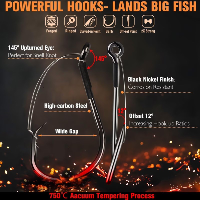 - Powerful Hooks- Lands Big Fish: Our weedless catfish hook made of high carbon steel. Forged construction for strength and durability. Curved-in point easily slices through lips. 145° Upturned eye for easy snelling. Black nickel finish & 12° offset technology make these hooks more corrosion-resistant and powerful. 2X Strong gives you confidence when fighting fish!