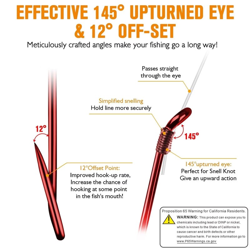 - EFFECTIVE 145° UPTURNED EYE & 12° OFF-SET: Meticulously crafted angles make your fishing go a long way! With the 145-degree upturned eye for simplified snelling, the line can be straight through the eye instead of taking a 90-degree bend, providing an ideal hold and angle. Perfect for the Snell knot. 12°offset allows the octopus hook more opportunity to catch at some point in the fish's mouth - improved hook-up rate!