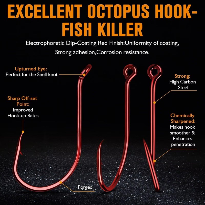 - RED AND BLACK COATED SHARP OCTOPUS HOOK: Black Octopus hooks are Black Nickel coated for corrosion resistance. Red Octopus hooks are Electrophoretic Dip-Coating Red coated for uniformity of coating and corrosion resistance. Red finish resembles injured baitfish, even the most wary fish to strike with confidence! Chemically Sharpened makes hook smoother and enhances penetration.