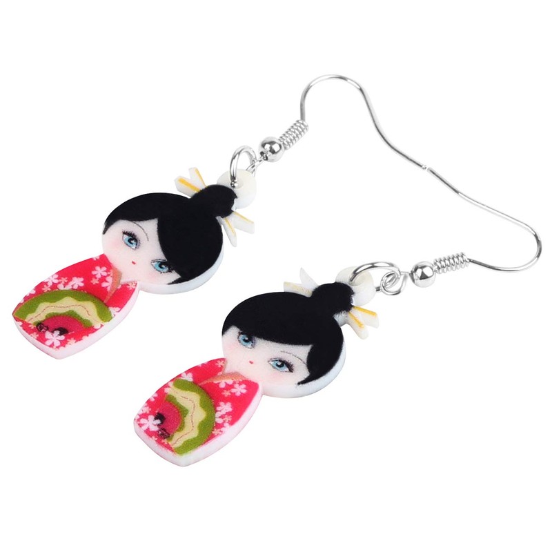 DOWAY Acrylic Cute Kawaii Kimono Dress Parasol Twins Girls Doll Earrings Fashion Jewellery for Women Girls Charms Party Gift, Acrylic, No Gemstone