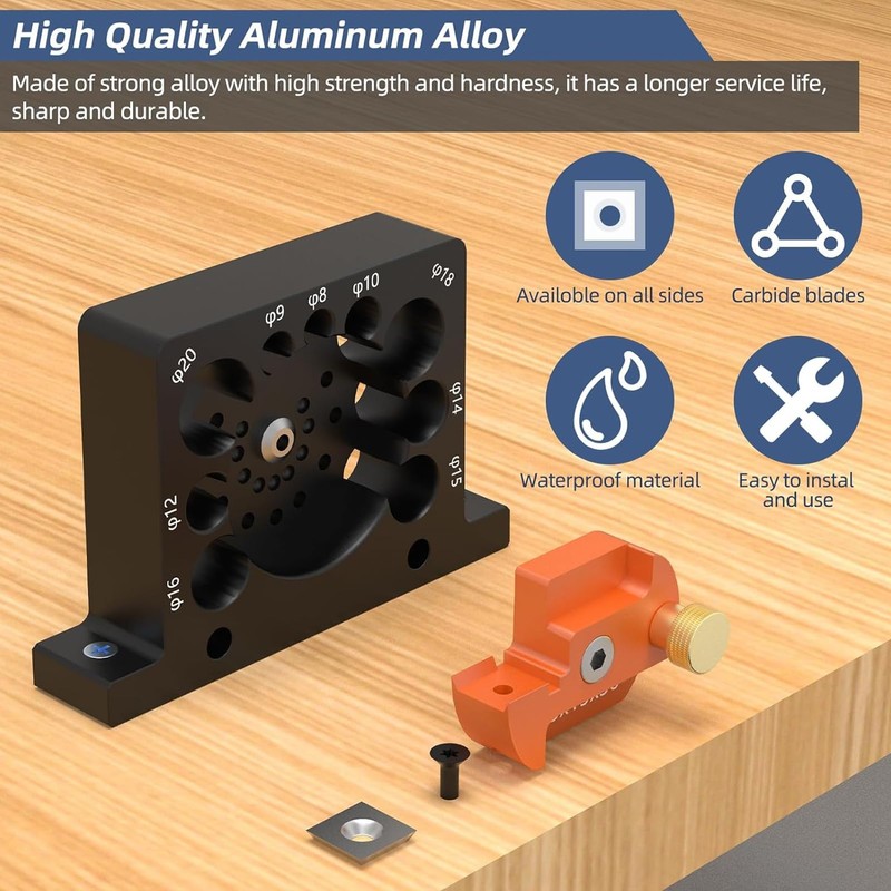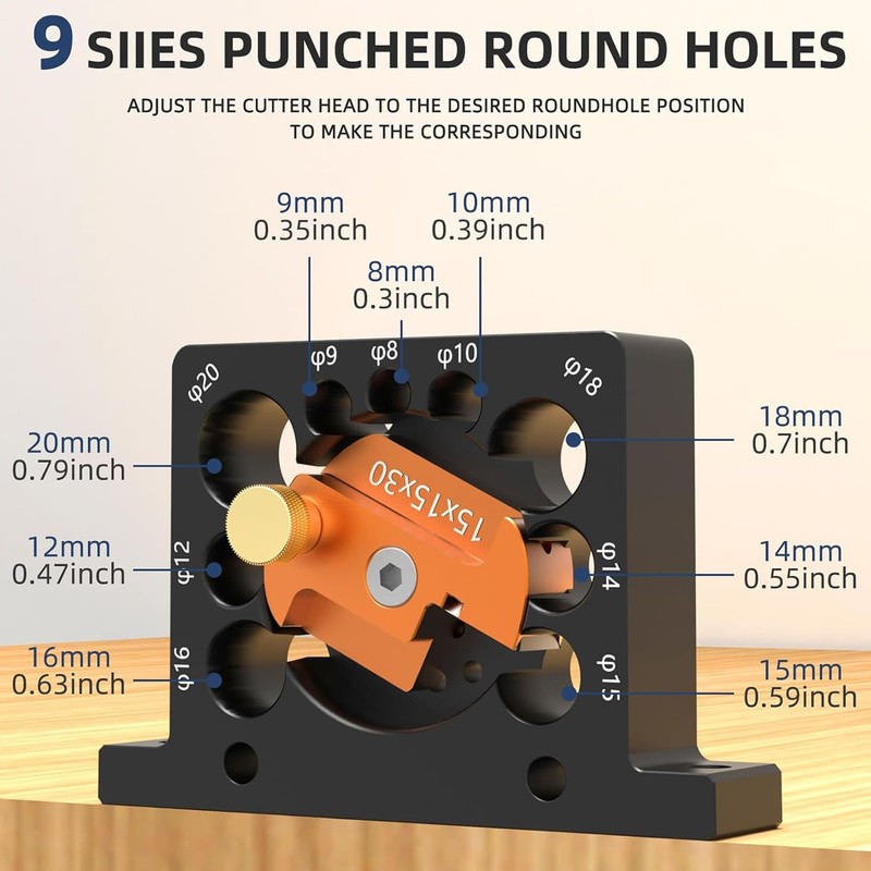 - HOLE SPECIFICATIONS: The dowel maker jig kit come with 9 holes of different diameters(8, 9, 10, 12, 14, 15, 16, 18, 20 mm) to meet different work needs. The attached blade can also be used interchangeably for quick and easy use