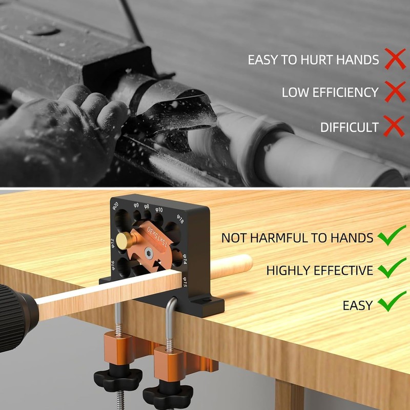 3. HOLE SPECIFICATIONS: The dowel maker jig kit come with 9 holes of different diameters(8, 9, 10, 12, 14, 15, 16, 18, 20 mm) to meet different work needs. The attached blade can also be used interchangeably for quick and easy use