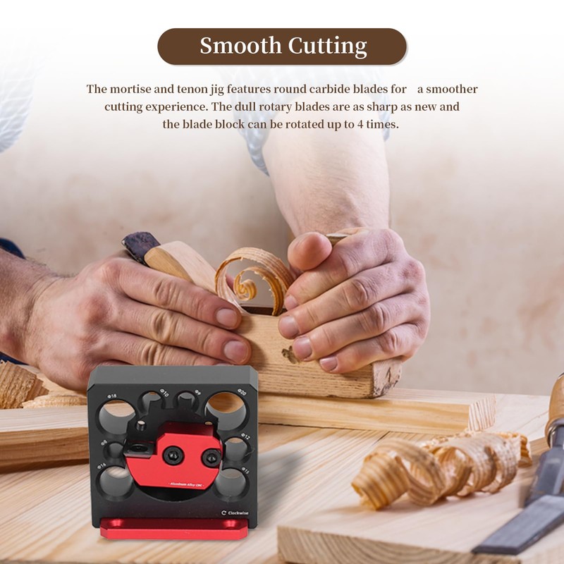 - SMOOTH CUTTING: The mortise and tenon jig features round carbide blades for a smoother cutting experience. The dull rotary blades are as sharp as new and the blade block can be rotated up to 4 times. Loosen the screw, rotate the red holder to the desired diameter, retighten the screw and you're ready to go.