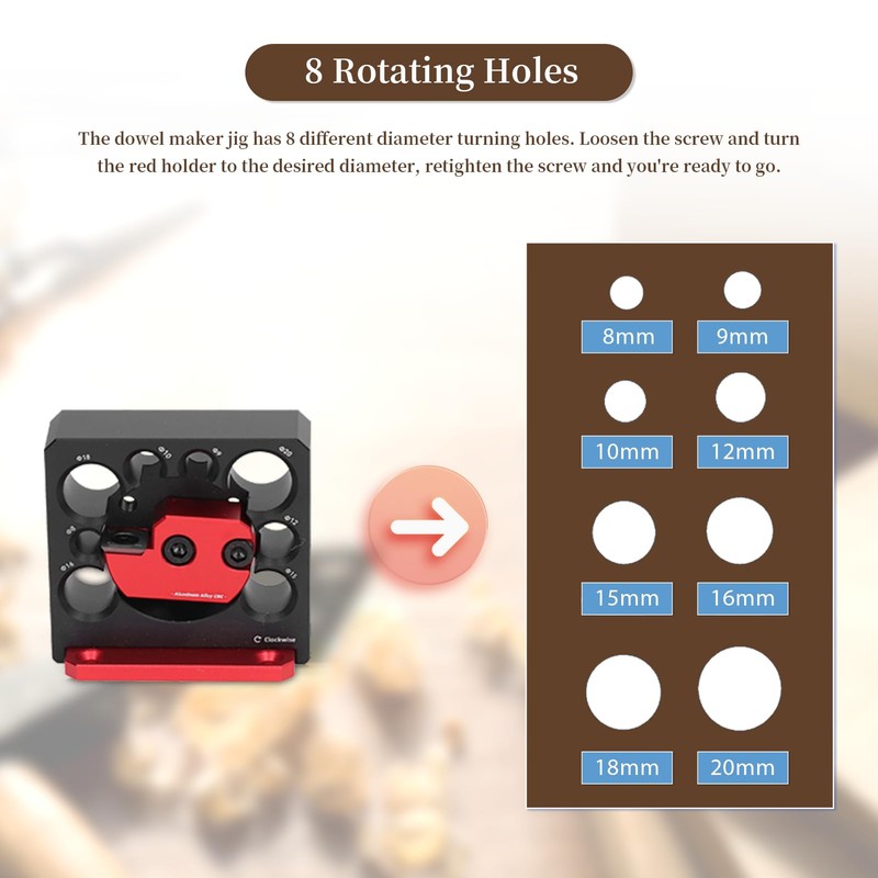 - 8 ROTATING HOLES: This Dowel Maker Jig has 8 holes of different diameters: 8mm, 9mm, 10mm, 12mm, 15mm, 16mm, 18mm, and 20mm to meet your various work needs.