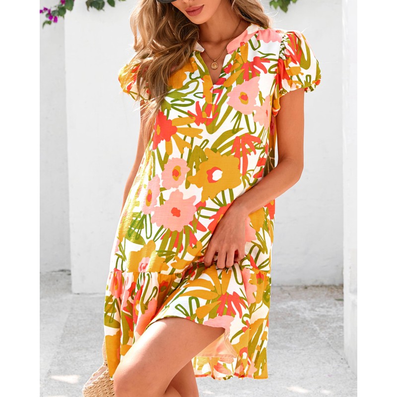- Feature: V Neck Dress; Puff Short Sleeve Dress; Printed Dresses; Floral Short Dresses; Ladies Sun Dress; Babydoll Dress; Spring Cute Dress; Women's Casual Dresses; Loose Fit Ruffle Dress; Boho Dress For Women; Two Side Pockets; Mini Dress with All Lining