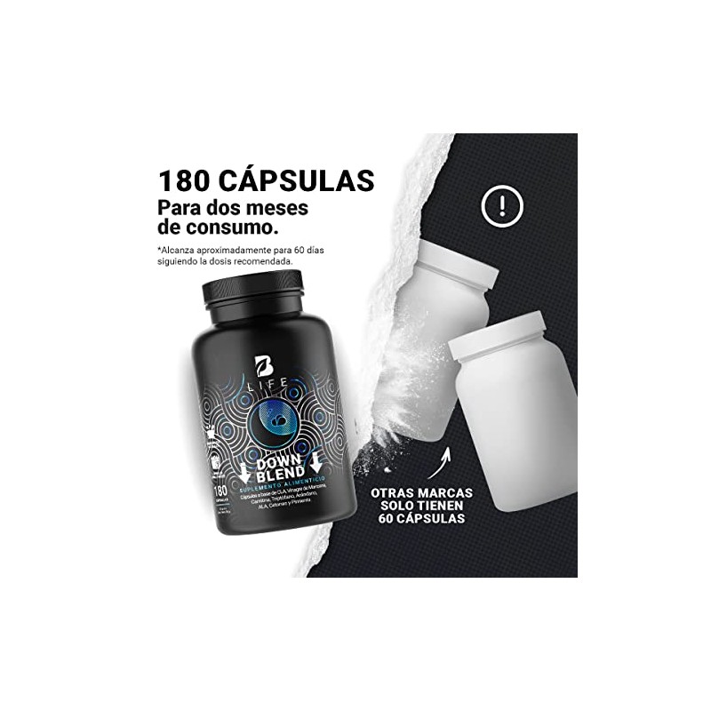 🌟 ⭐ Down Blend de 180 Cápsulas. Ingredientes naturales: CLA, Vinagre de Manzana, Carnitina, Triptófano, Ácido Alfa Lipoico y Cetonas de Frambuesa. Down Blend B Life. ⭐ 🌟
