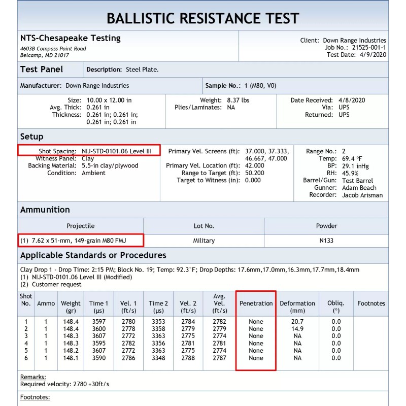 • Tested to defeat 6 rounds from 7.62 x 51 (.308) @ 2780 fps (see 3rd party ballistic lab results)