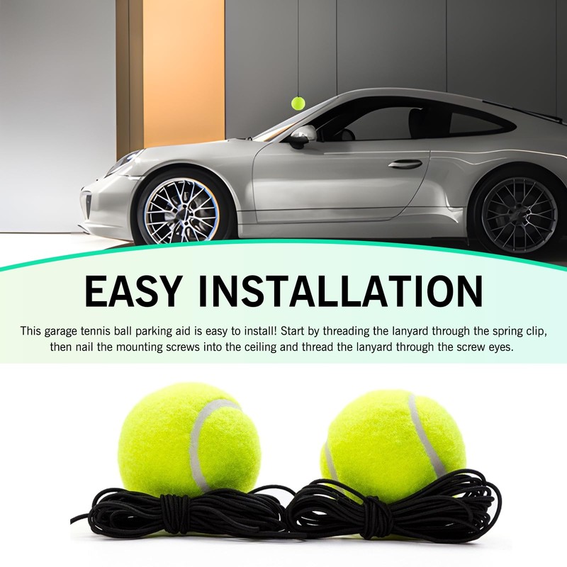 - Package Contents: The package includes 2 garage parking tennis ball stoppers with lanyards, 2 adjustable clips, and 2 screws. The surface of the tennis ball is soft and elastic, preventing scratches on the windshield and caring for your car with great attention.