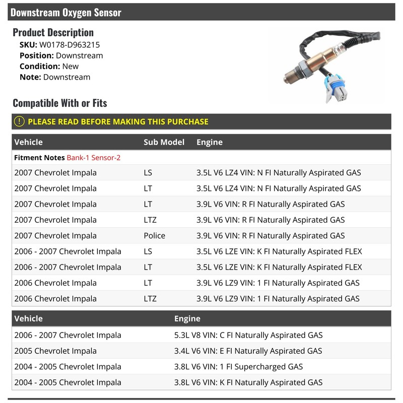 - Compatible with or fits: (Note: Bank: 1; Sensor: 2) 2006 - 2007 Chevrolet Impala LT 3.5L V6 LZE VIN: K FI Naturally Aspirated Flex | (Note: Bank: 1; Sensor: 2) 2006 Chevrolet Impala LT 3.9L V6 LZ9 VIN: 1 FI Naturally Aspirated Gas | (Note: Bank: 1; Sensor: 2) 2006 Chevrolet Impala LTZ 3.9L V6 LZ9 VIN: 1 FI Naturally Aspirated Gas