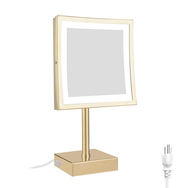 DOWRY Tabletop LED Lighted 5X Magnifying Makeup Mirror Square with Plug 8 Inch Polished Gold Finished