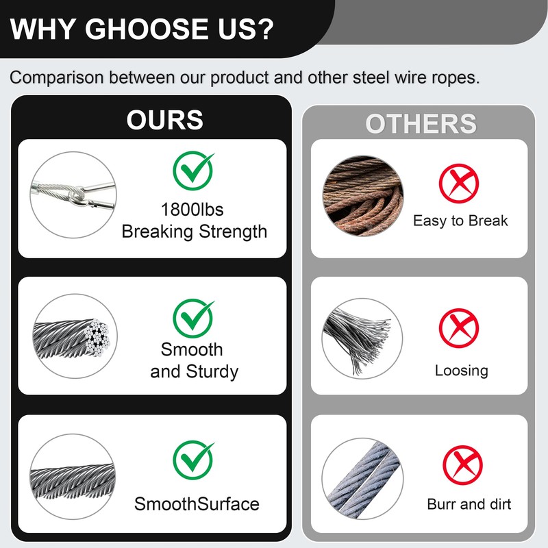 - Smooth Surface: The steel wire rope boasts a sleek surface, elegant polish, and no sharp edges, safeguarding your hands, preventing injuries and damage. Tailor the length using a cutter to achieve your desired cable without any rough edges