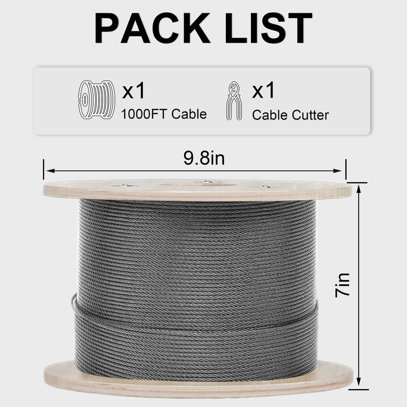 - Packing List: 1 x 1000ft stainless steel wire rope, equipped with a wire rope cutter for convenient operation