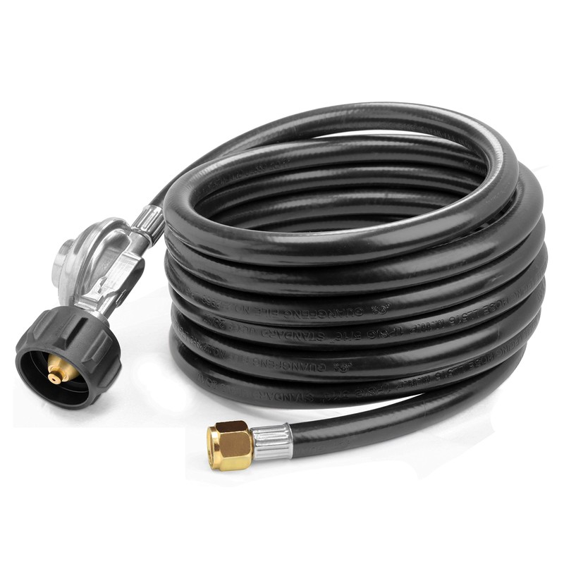 High Quality Material:100% solid brass can be effective corrosion protection.Ensure Your Safety:Our propane regulator with hose has excess flow protection for your safety and will automatically shut off.Convenient Installation: Installs quickly and easily tool-less attachment to propane tanks and cylinders.Apply to: Gas grills ,heaters, lanterns, camp stoves, tabletop grills, fire pit table and more.Great for: BBQ, camping, tailgating, heating needs or having an outdoor cookout.Product Specification:Type:Low pressureVerticalInlet Pressure:25-250 PSIOutlet Pressure:11" W.C.Flow Capacity: 95000 BTU/HourCertificate:CSALength:12 feet (length of rubber hose only)For your safety, please read before using the hose.Attention:1.FULLY TIGHTENED at both propane tank side and grill side before using on your propane appliances.2.Check and make sure the hose is away from the OPEN FIRE before installing it to your appliances.3.Keep the hose away from HIGH TEMPERATURE.