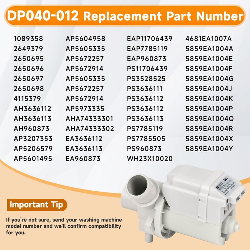 - Dp040-012 Replacement Part Number:OEM Dp040-012 4681EA1007A Drain Pump Replace WH23X10020, AHA74333301, AHA74333302, PS11706439, PS3528525, PS3636112, PS960873, PS3636113, AP3207353, PS960873, EAP960873, 2649379, AP5672914, EAP7785119, PS7785119 Drain Pump. 4681ea1007a Washer pump works with top load washer drain pump.