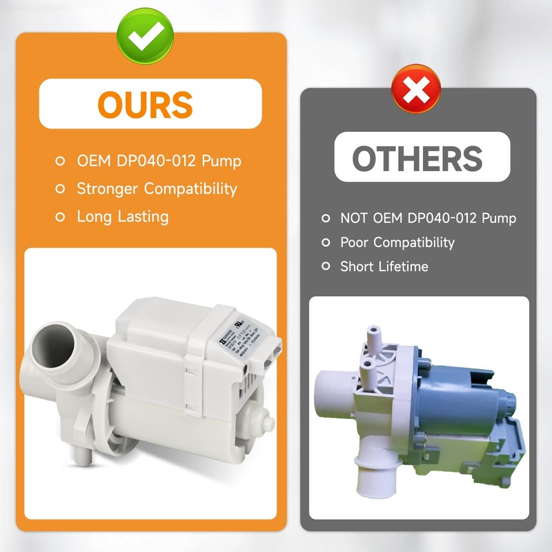 - 4681EA1007A Washer Drain Pump Solves Common Washer Symptoms: DP040-012 washer drain pump is OEM Parts Washer Pump. High quality and long duration. DP040-012 pump solves the common washer symptoms: 1. Not draining or draining slowly. 2.Visible leaks or pooling of water around the drain pump. 3.Unable to complete the wash program due to poor drainage. 4.Unusual noise from the pump. 5.Fault codes related to drainage or pump failure displayed on the control panel.