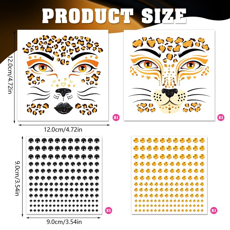 - 【Leopard Temporary Tattoos】The Leopard tattoo set includes 2 sheets of Leopard face tattoos that go perfectly with any Leopard costume for kids adults women. In addition, there are 1 sheet in orange and 1 sheet in black sparkling face gems. Each sheet contains 165 diamond stickers, which are available in four different sizes. Suitable for DIY and creating unique, personalized designs.