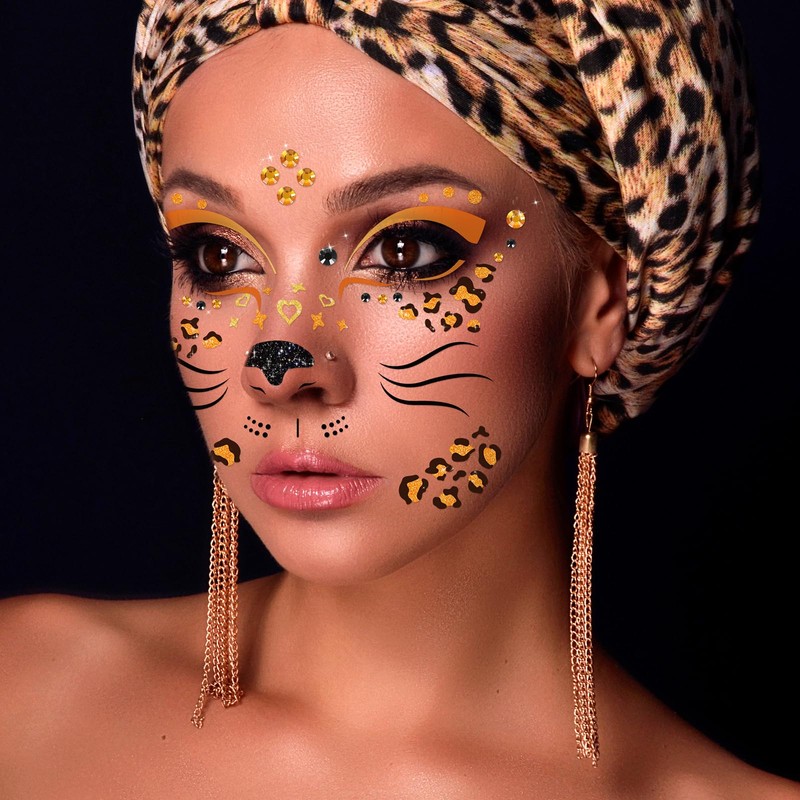 - 【Buy with Confidence】Unleash your wild side with our Leopard Face Tattoos and Glitter Gems set, the perfect accessory for anyone looking to add a touch of fierce elegance to their costume or everyday look. The combination of temporary tattoos and glitter gems offers numerous possibilities to create creative and magical looks. You can find more face tattoos, festival temporary tattoos in the DPKOW store!