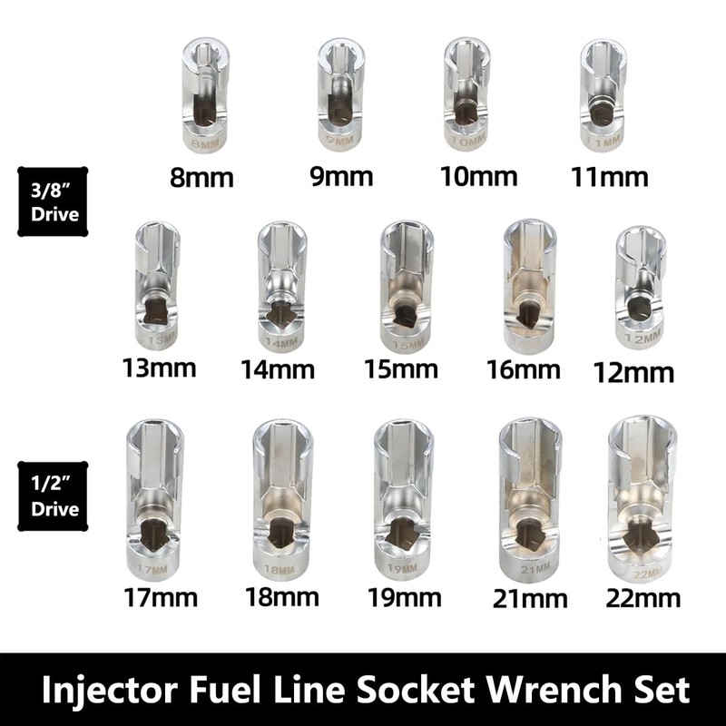 - Specification: This injector fuel line socket set contains 14 piece metric line socket covering 3/8“ and 1/2” drive. The 1/2” drive line socket size are 8mm, 9mm, 10mm, 11mm, 12mm, 13mm, 14mm, 15mm and 16mm; The 3/8“ drive line socket size are 17mm, 18mm, 19mm, 21mm and 22mm