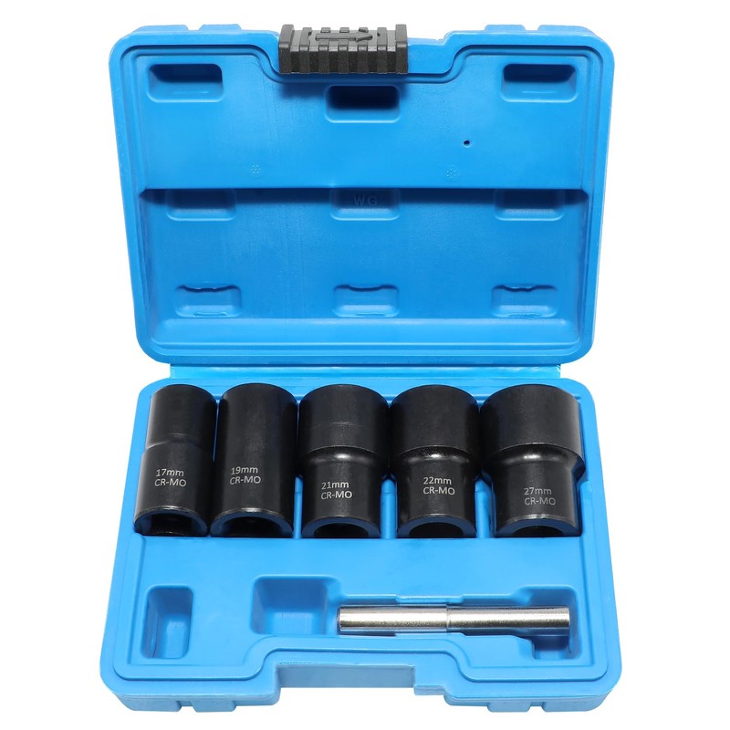 - Specification: the lug nut remove socket set include 17mm, 19mm, 21mm, 22mm 24mm socket, with 1/2" drive, you can use ratchet wrench, impact. nut removal bar use to remove nut from socket